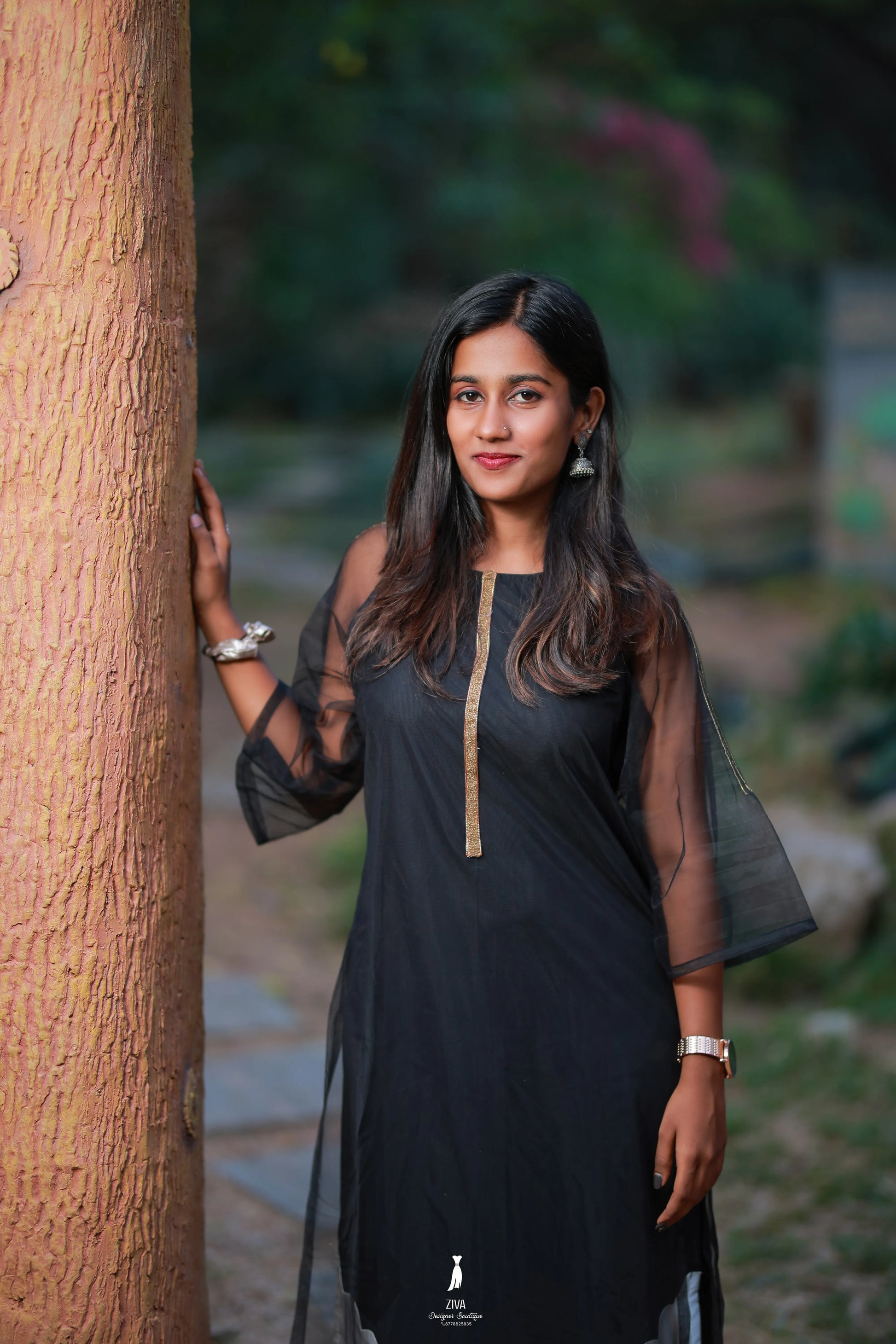Turn heads with timeless charm in our Midnight Muse Kurti, a luxurious piece that effortlessly blends sophistication and modern flair. Crafted in rich black organza fabric, this kurti features sheer sleeves with fine threadwork and a dramatic metallic wave-pattern hemline in silver and white — bringing a bold, fashion-forward edge to a classic silhouette.