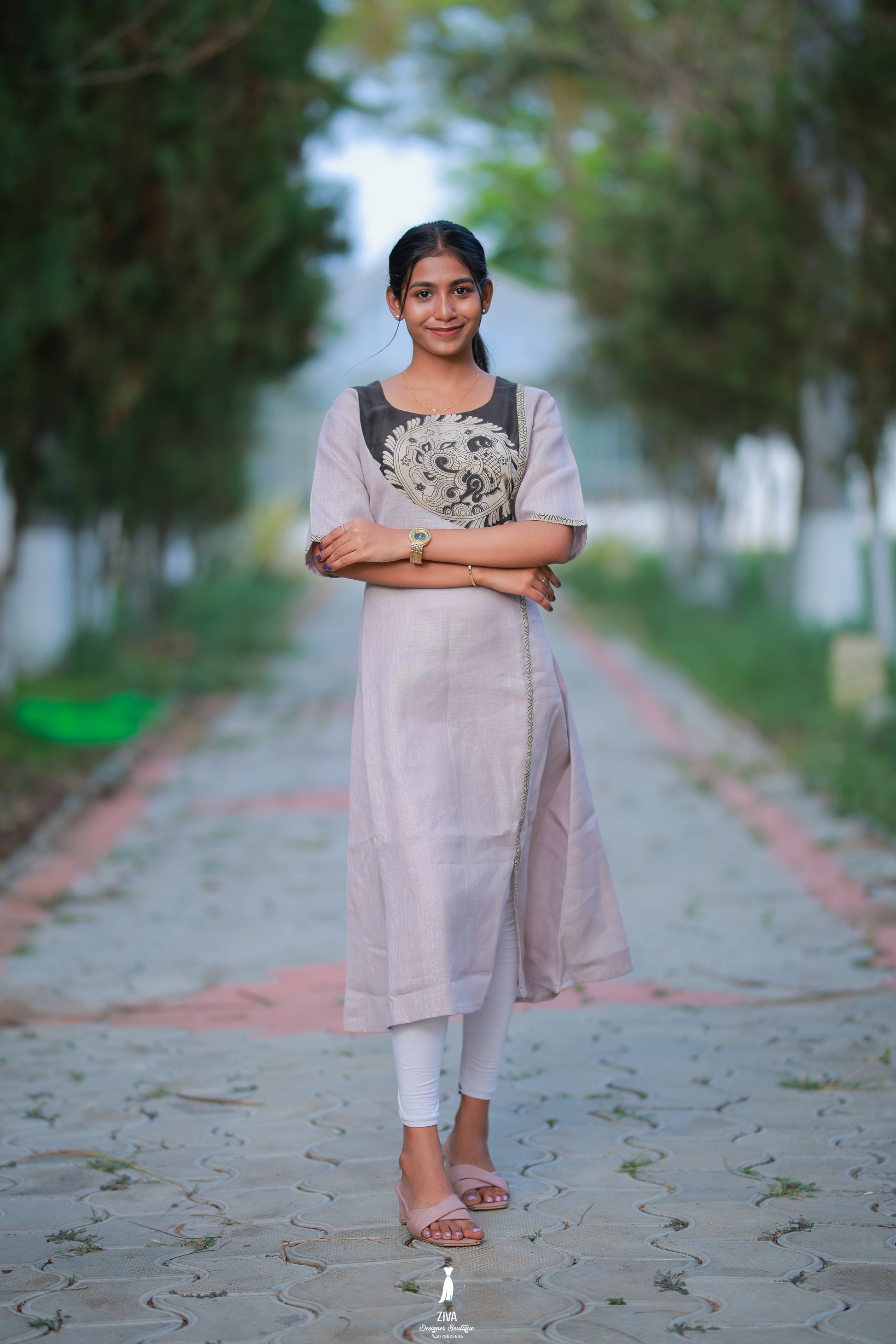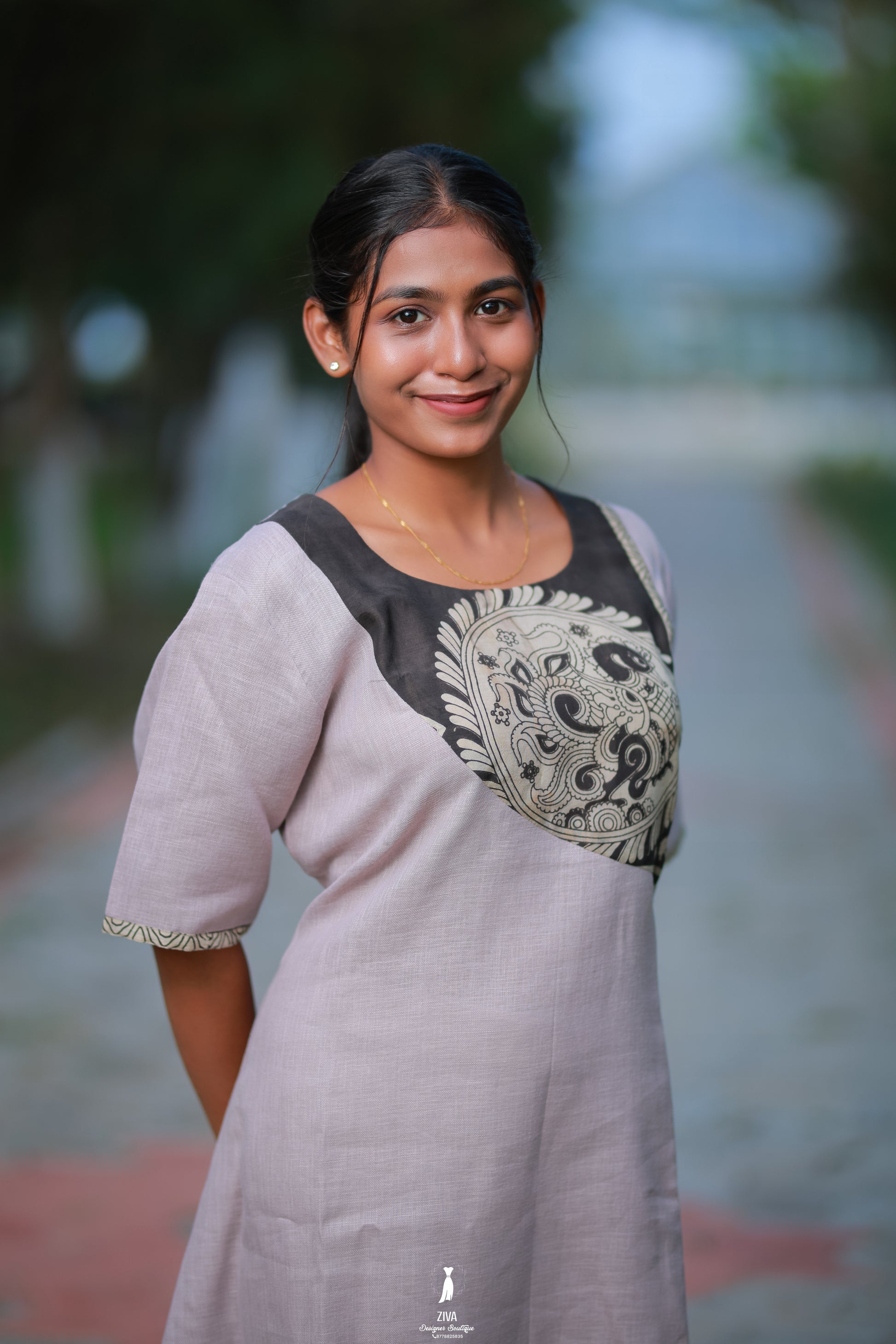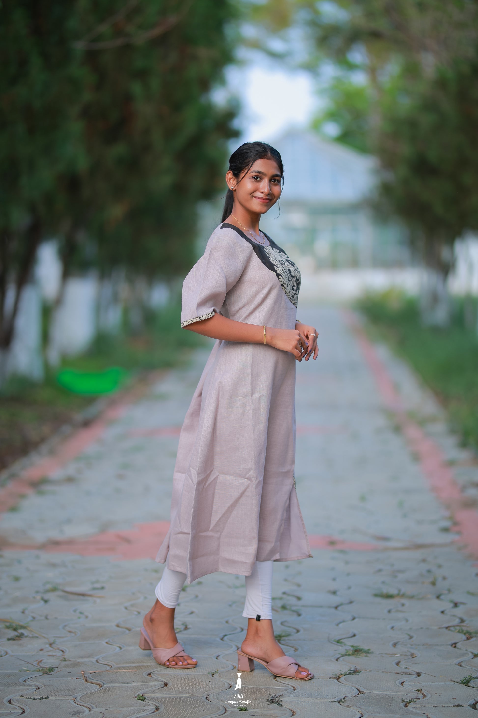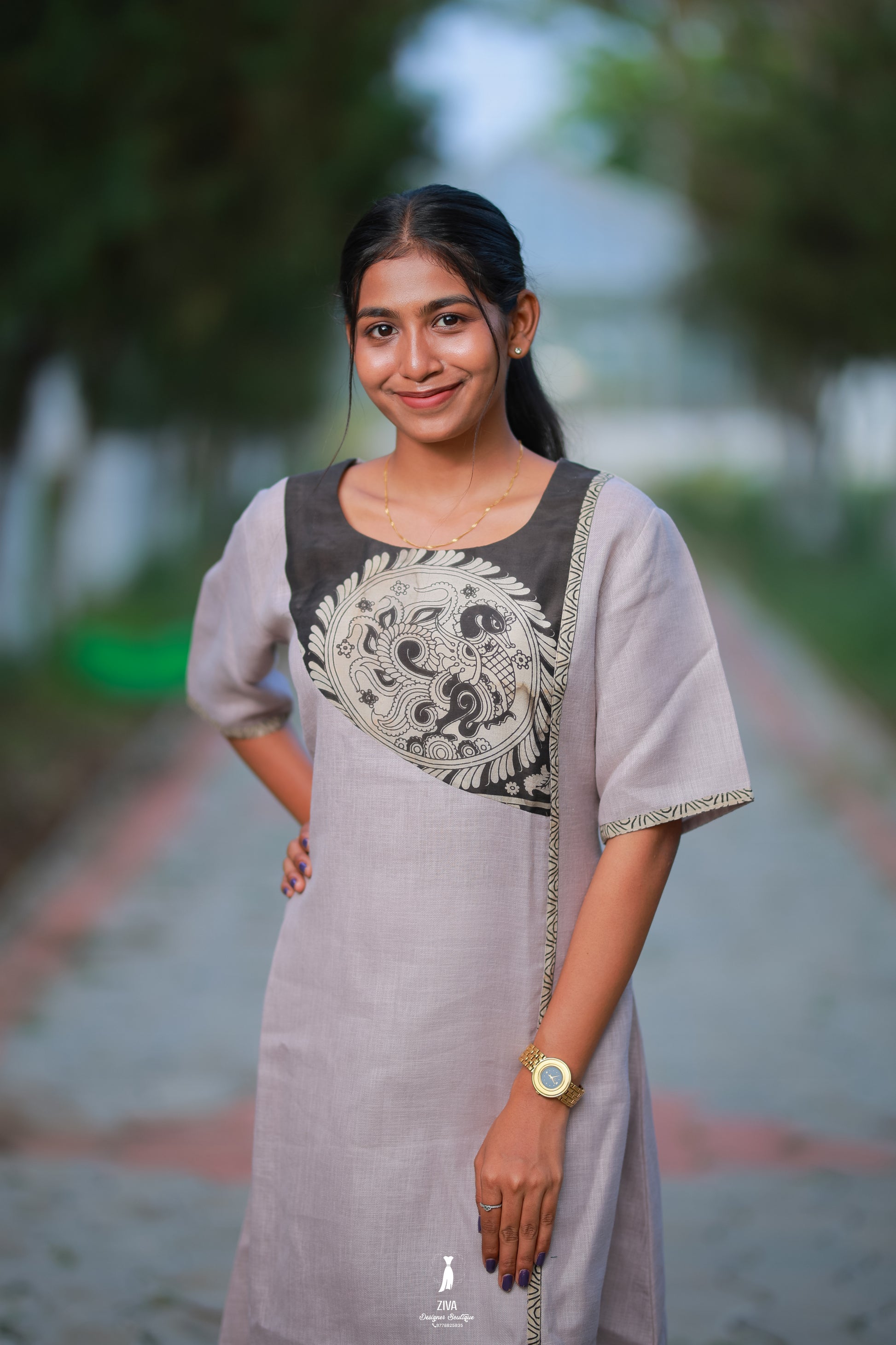 Channel ethnic charm with contemporary grace in this Dusky Beige Kalamkari Panel Kurthi. Tailored from a breathable cotton blend, this kurthi stands out with its intricately printed Kalamkari-inspired central motif on a contrasting dark panel. The classic straight silhouette, elbow-length sleeves, and decorative printed piping on the sleeves and side seams lend a refined finish to the design.