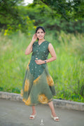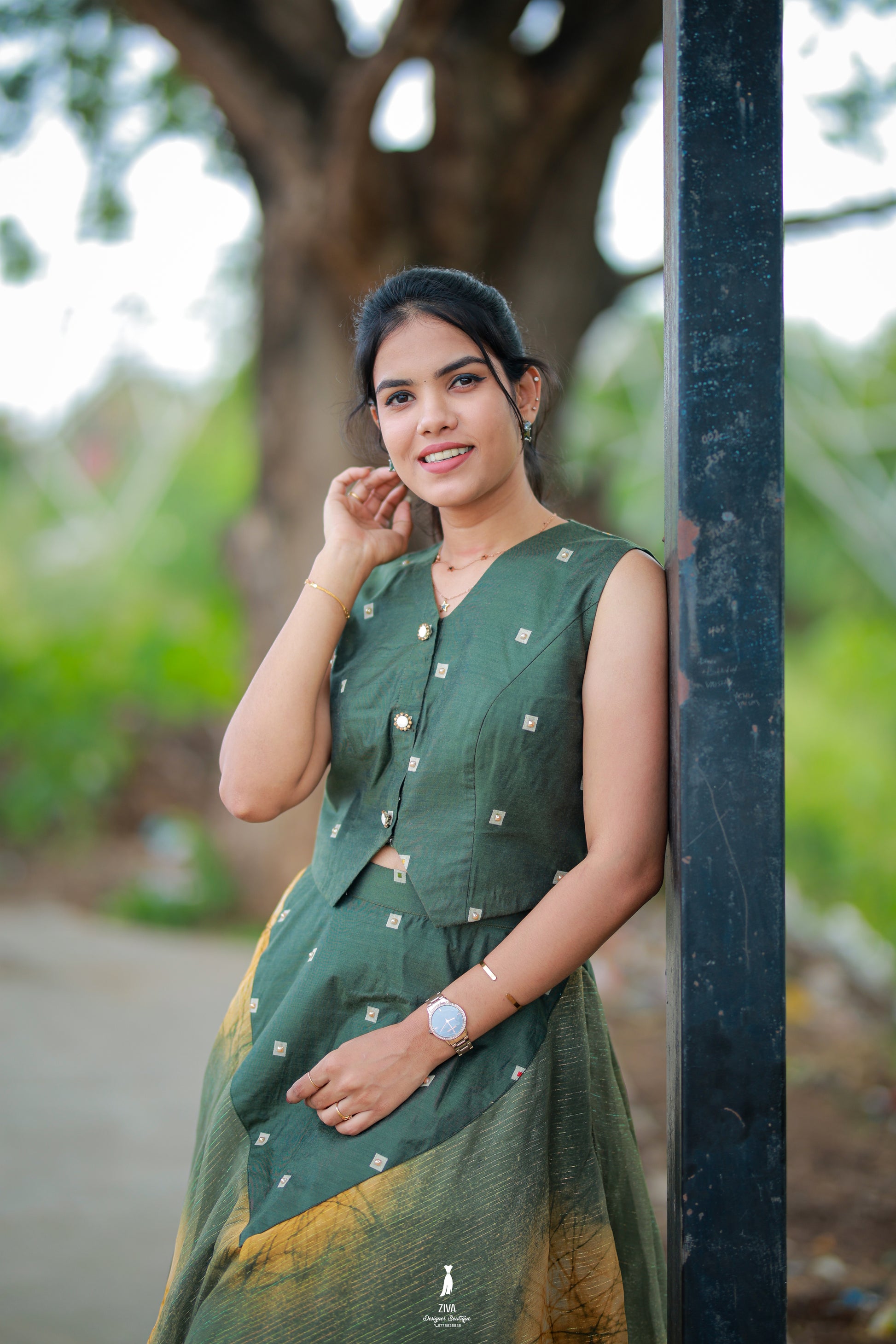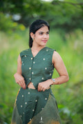 Redefine contemporary ethnic style with this elegant olive green co-ord set. Crafted in premium cotton silk blend, the ensemble features a sleeveless front-buttoned crop top adorned with subtle square motifs and delicate golden buttons for a refined finish. The matching flared skirt showcases a graceful drape with panel detailing, creating a sophisticated fusion silhouette.