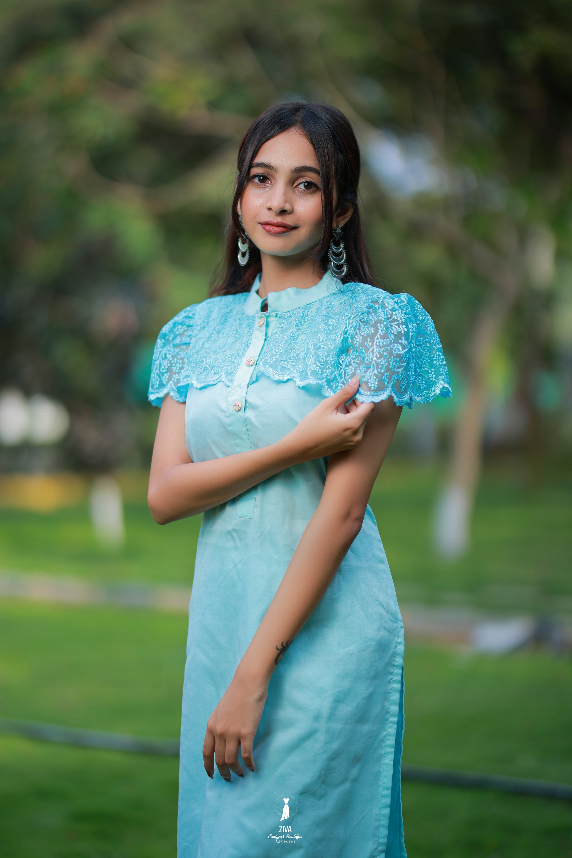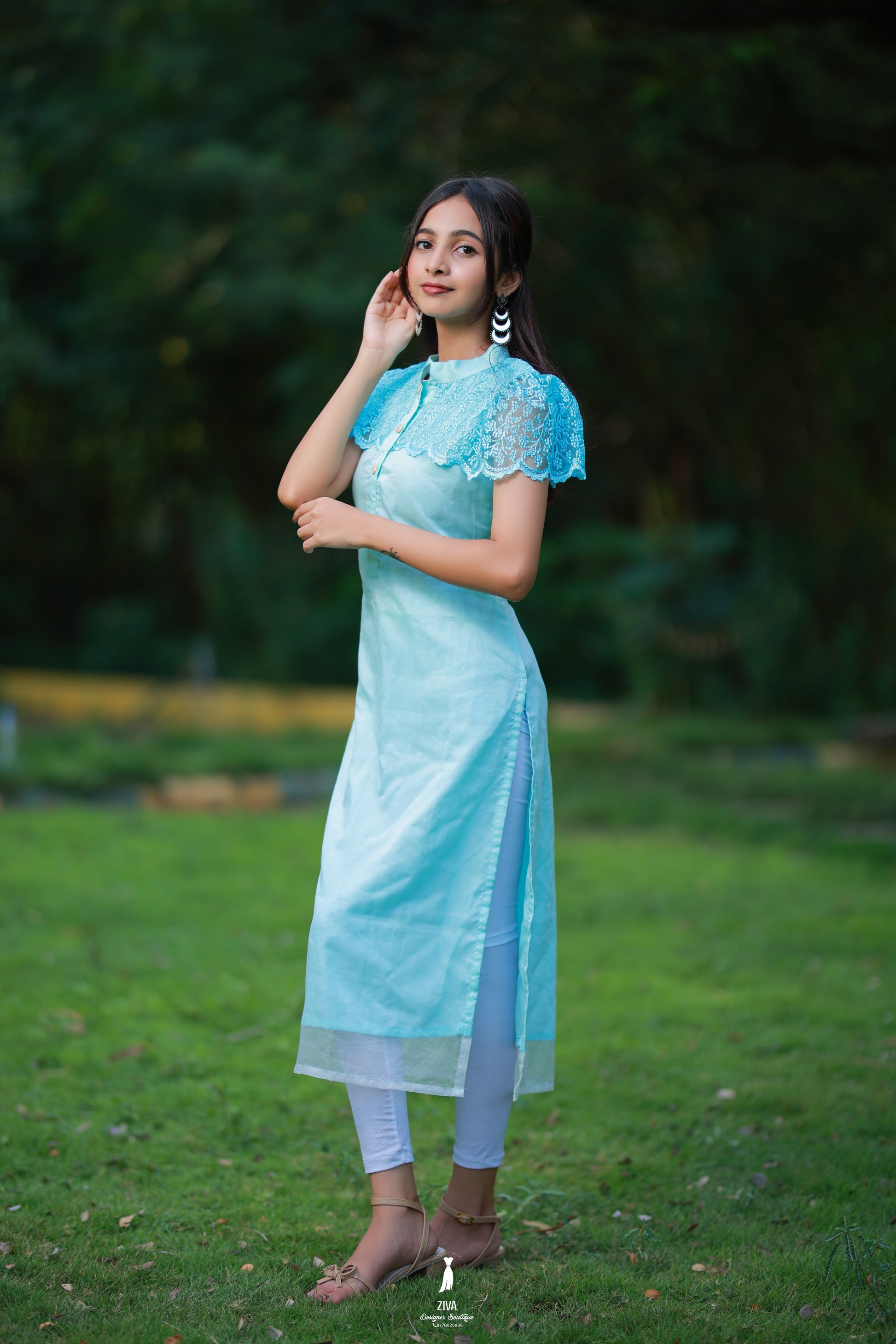 Elevate your everyday ethnic look with this Sky Blue Mandarin Collar Kurti, designed with a refreshing modern twist. Made from a smooth, lightweight fabric, this kurti features a structured mandarin collar and a button-down front placket. The true highlight lies in its intricate lace cape-style yoke—elegantly draped over the shoulders, it adds a layer of vintage charm and delicate femininity.