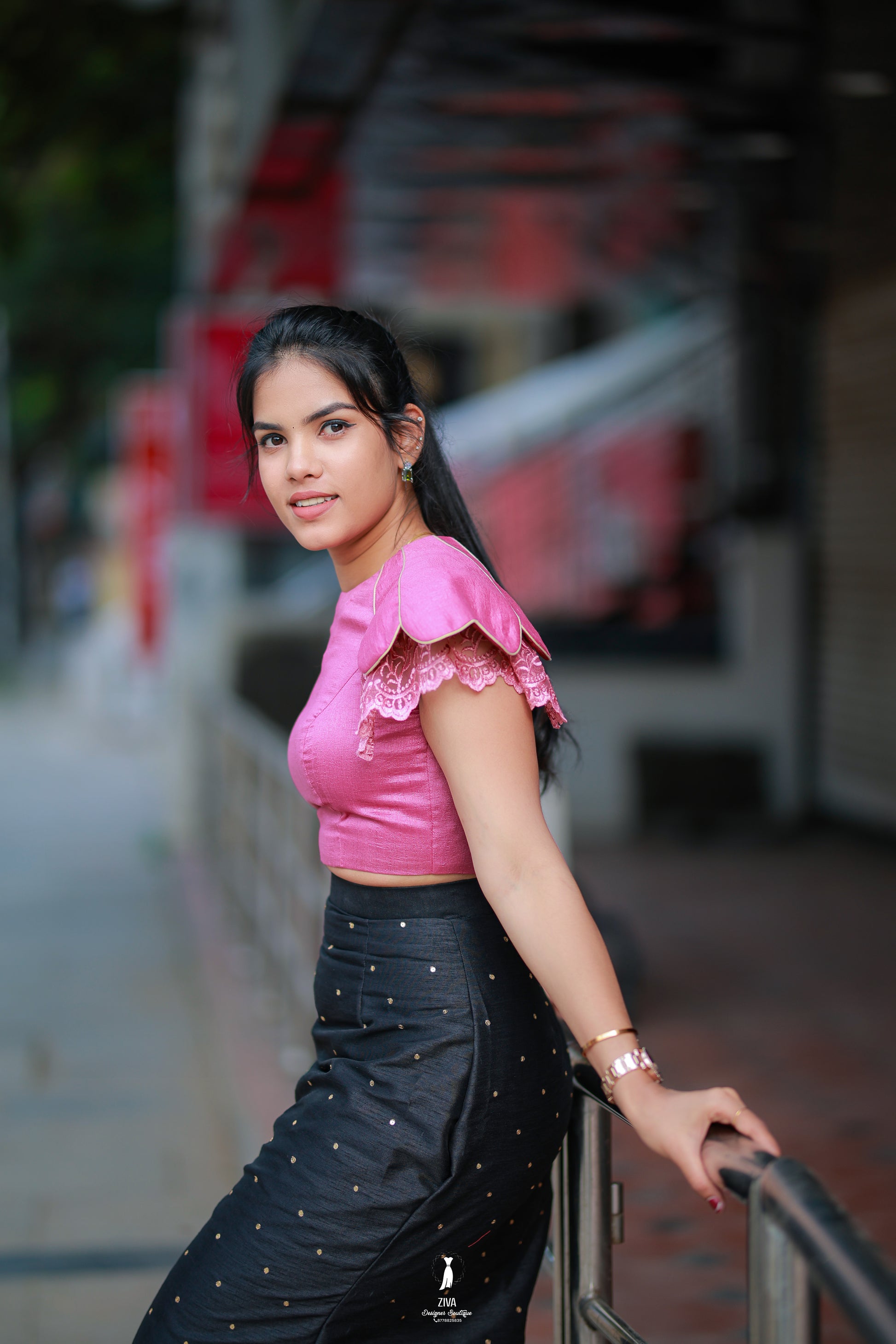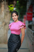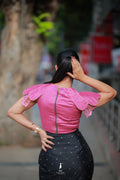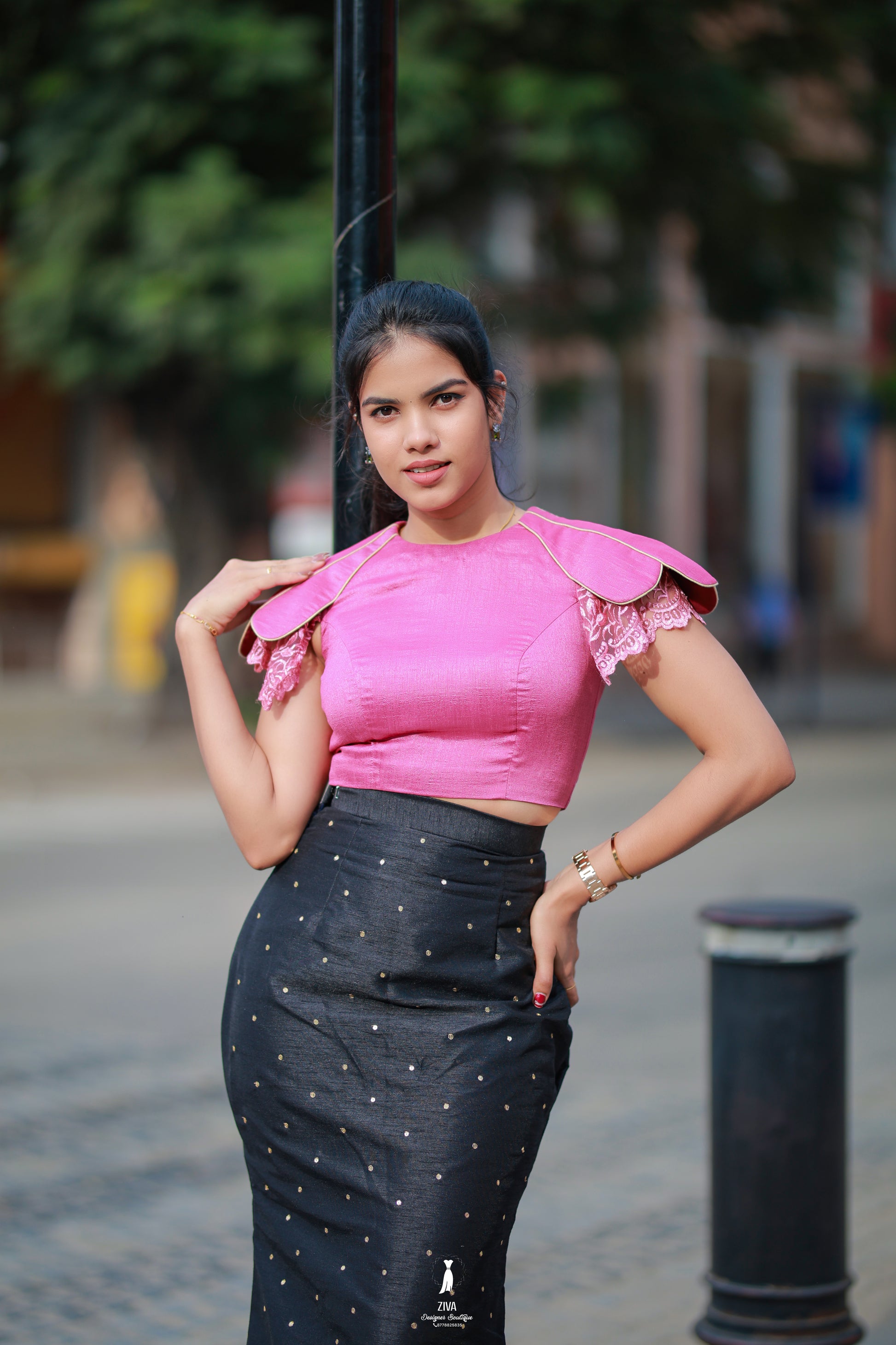 Playful Pink Hem: A striking contrasting border in a matching fuchsia pink with a charming scalloped or raw-edge finish creates a cohesive look with the crop top and adds a playful, artisanal touch.